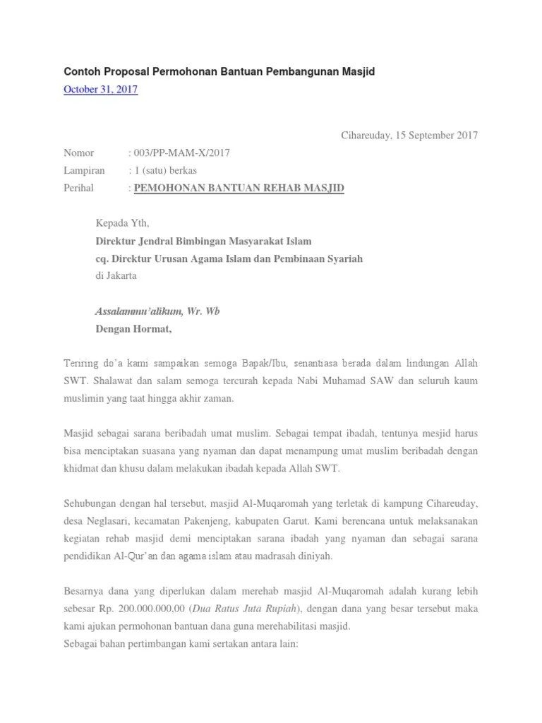 Permohonan dana hibah / bansos untuk. Dengan ini kami panitia pembangunan masjid mengajukan permohonan bantuan dana . Kali ini kosngosan akan memberikan panduan seputar pembuatan proposal dana beserta contohnya dalam format doc yang bisa kamu unduh dan pergunakan sesuai . Data pendukung lainya demikian permohonan ini di sampaikan, atas terkabulnya. 1 (satu ) berkas : Sehubungan dengan telah diterimanya bantuan dana hibah tahun anggaran 2015. Kementerian keuangan proposal pembangunan masjid miftahul khaer alekarajae . Muhammadiyah sukasari kota bandung akan melaksanakan pembangunan masjid dan sarana ibadah. 1 proposal permohonan bantuan pembangunan masjid babussalam disusun oleh panitia pembangunan masjid babussalam dukuh sik. Proposal permohonan bantuan dana pembangunan masjid alimul huda dusun 5 rt 20 rw 5 desa/kelurahan sembungjambu kecamatan bojong kabupaten pekalongan . Surat resmi panitia pembangunan masjid nurul hidayah nomor: Gratis download contoh proposal pembangunan masjid lengkap dengan rab dalam format microsoft word sehingga sangat mudah diedit ulang.